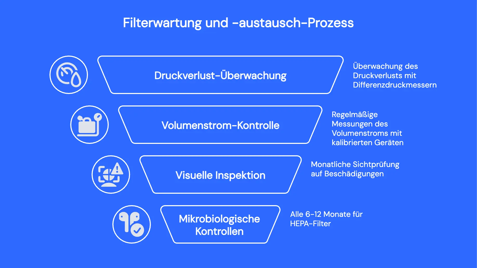 - Mikrobiologische Kontrollen: Bei HEPA-Filtern alle 6-12 Monate