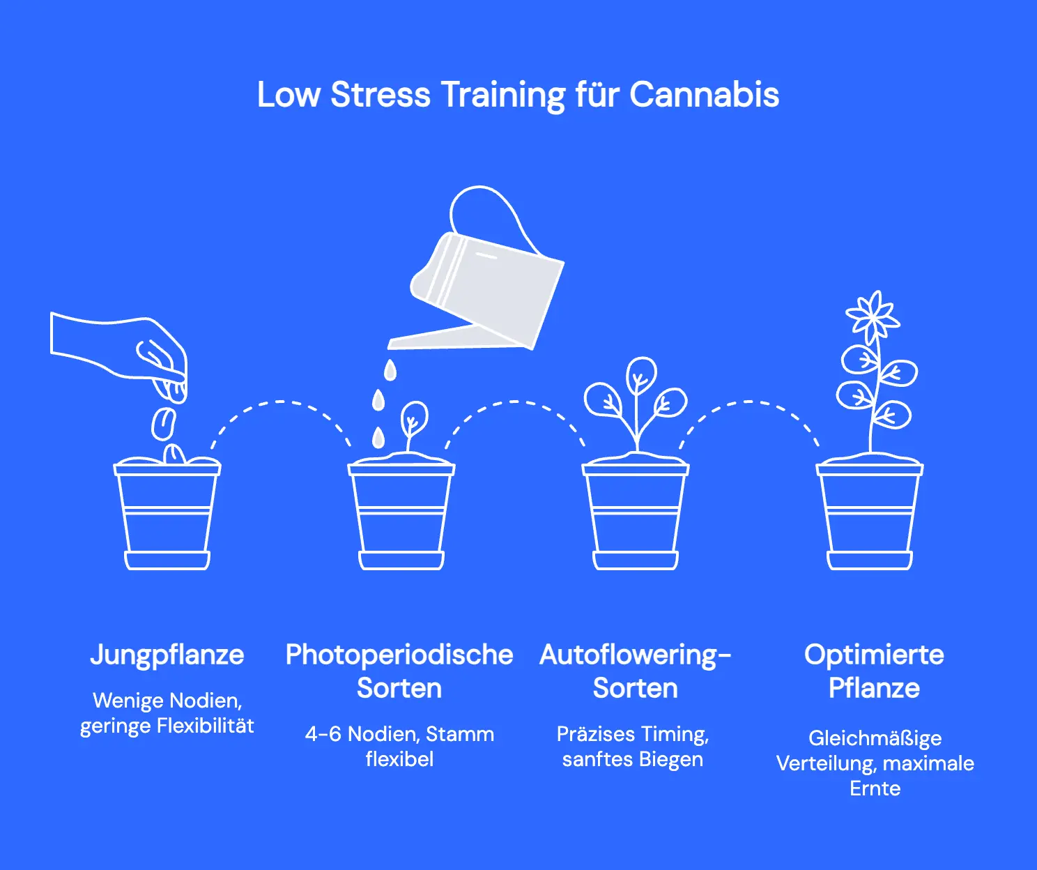 Diese professionelle Low Stress Training Anleitung basiert auf bewährten Protokollen aus kommerziellen Anbaubetrieben und wurde für verschiedene Erfahrungsstufen optimiert.