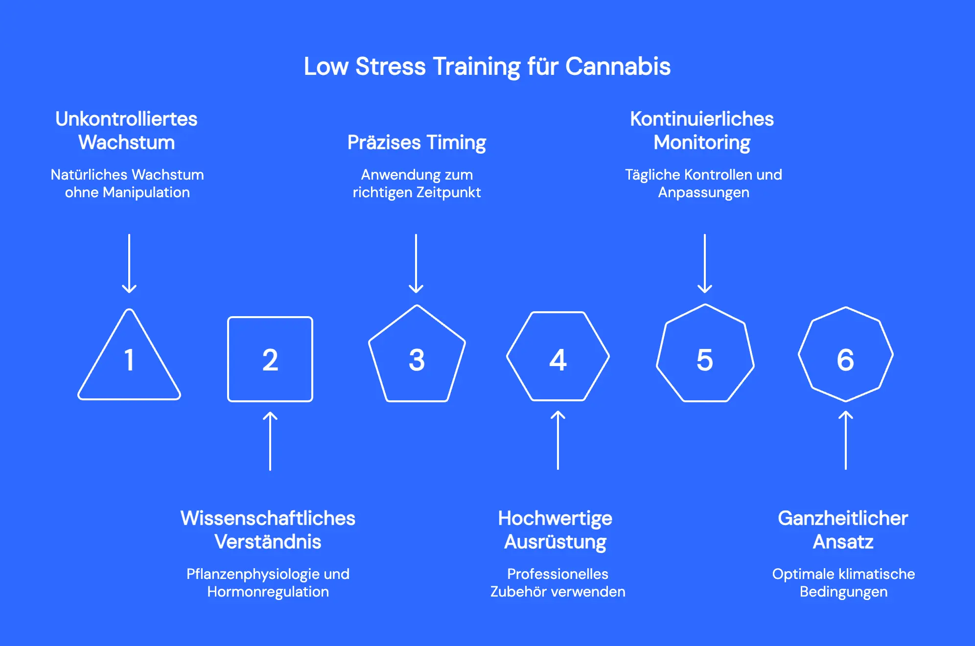 Beginnen Sie noch heute mit der systematischen Anwendung von Low Stress Training und erleben Sie, wie Ihre Pflanzen ihr volles genetisches Potenzial entfalten – ganz ohne unnötigen Stress, aber mit maximalen Erträgen und erstklassiger Qualität.